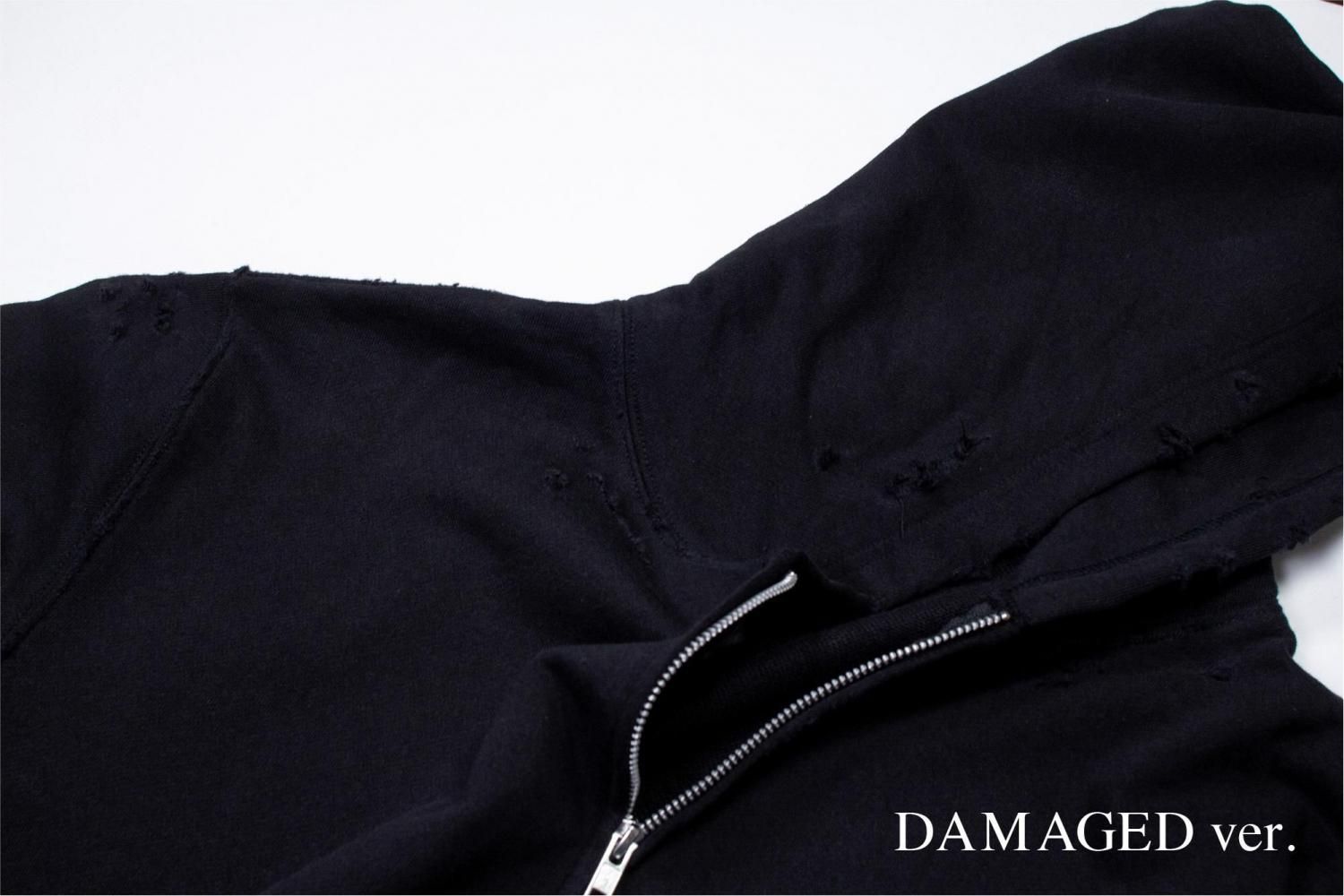 襟ぐりやフード、袖、裾にダメージ加工を施し、よりハードな印象に仕上げています。